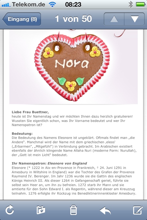Bis eben wusste ich gar nicht, dass Werbung bildet. Tut sie aber. Dank Heine weiß ich jetzt: heut ist mein Namenstag – also nicht “Nora” sondern die unverkürzte “Eleonore” – zumindest in Deutschland, Österreich und Frankreich. Das wiederum kommt dann aus Wiki.