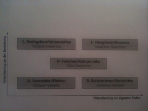 Neben den “vier Seiten einer Nachricht” (nach Schulz von Thun) und der Wirkung von Körpersprache mit 80% (ich glaube es immernoch nicht) ging es z.B. um Konflikttypen und Eskalationsstufen und um den eigenen Konfliktstil. Ja, es ist schon klar … in einem Workshop mit 17 Mann kann unmöglich der eigene Konfliktstil ausführlich beleuchtet und analysiert werden. Um das Thema einzugrenzen und greifbar zu machen, erhielten wir eine Checkliste mit 25 Aussagen, denen einzelne Buchstaben zugeordnet waren. Hm … mein erster Gedanke war: wie in einer Frauenzeitschrift (bei denen ich solche Test´s in aller Regel überblättere).